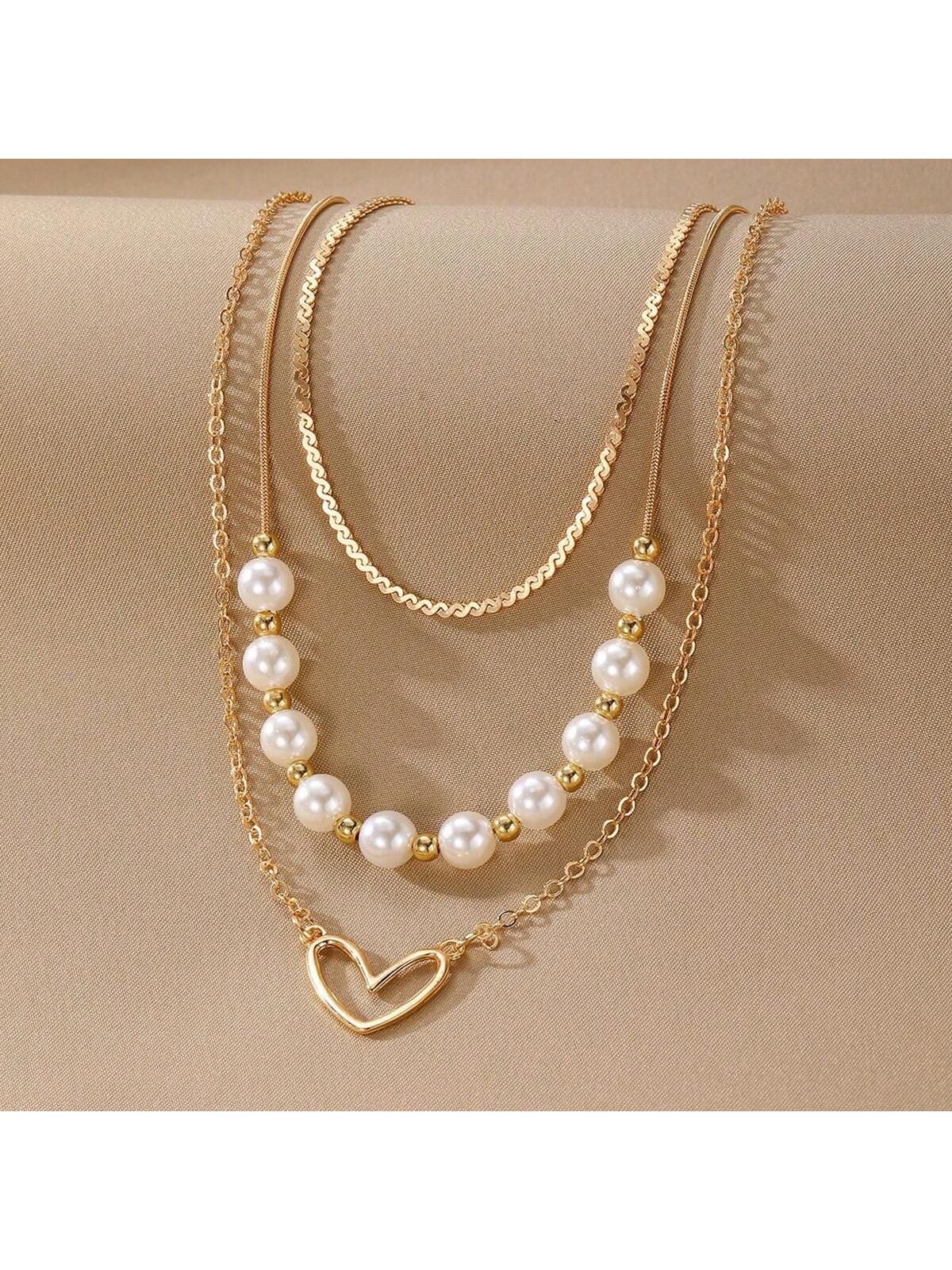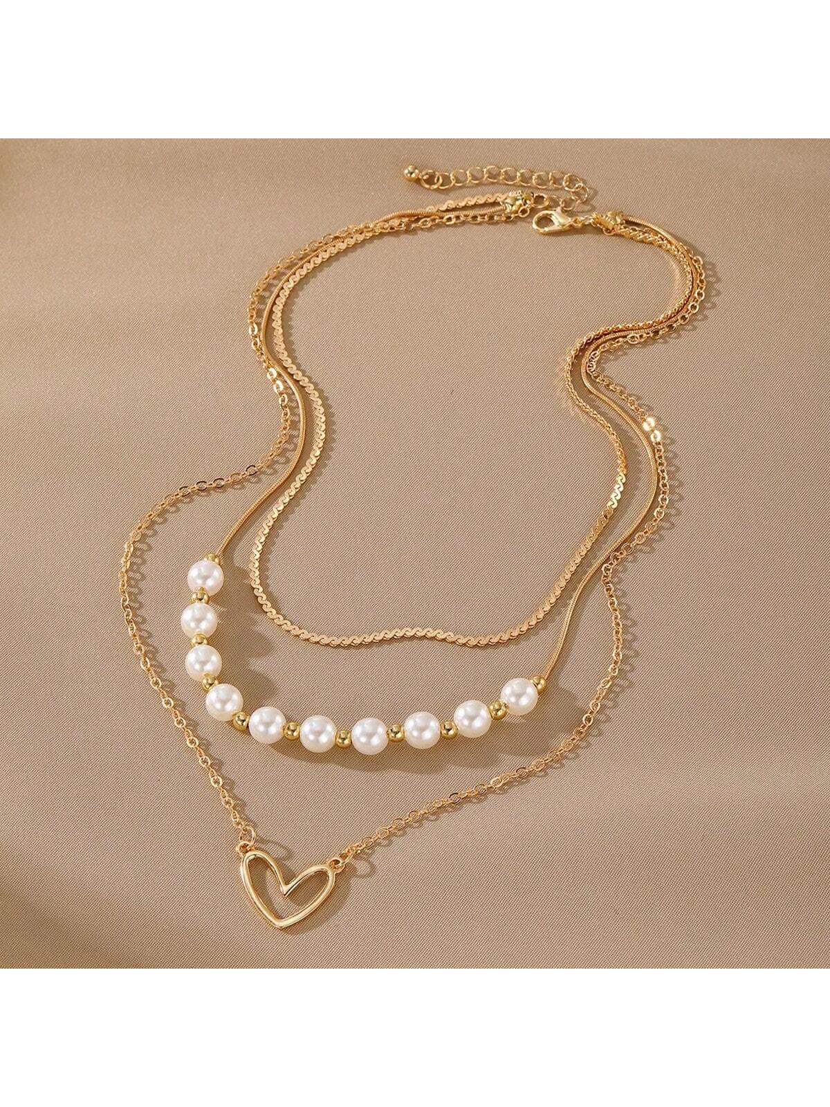 3pcs/Set Multi-Layer Necklace With Heart Shaped & Faux Pearl Charm, Gold Tone, Fashionable & Vintage Style Valentines,Mom,Mother,Mother's Day,Gift