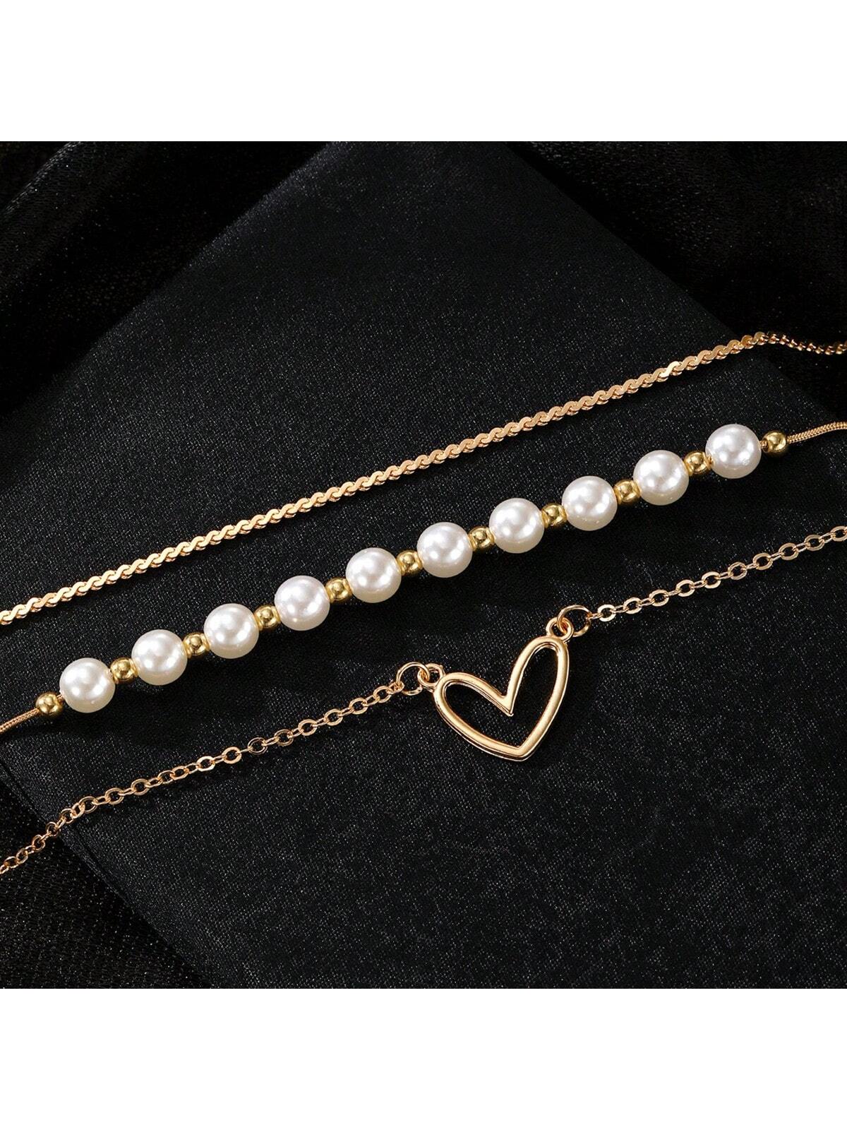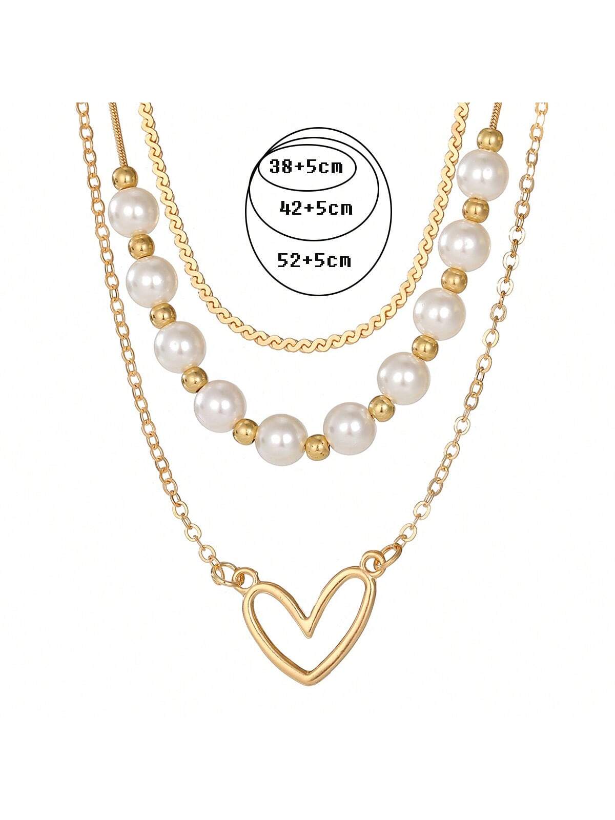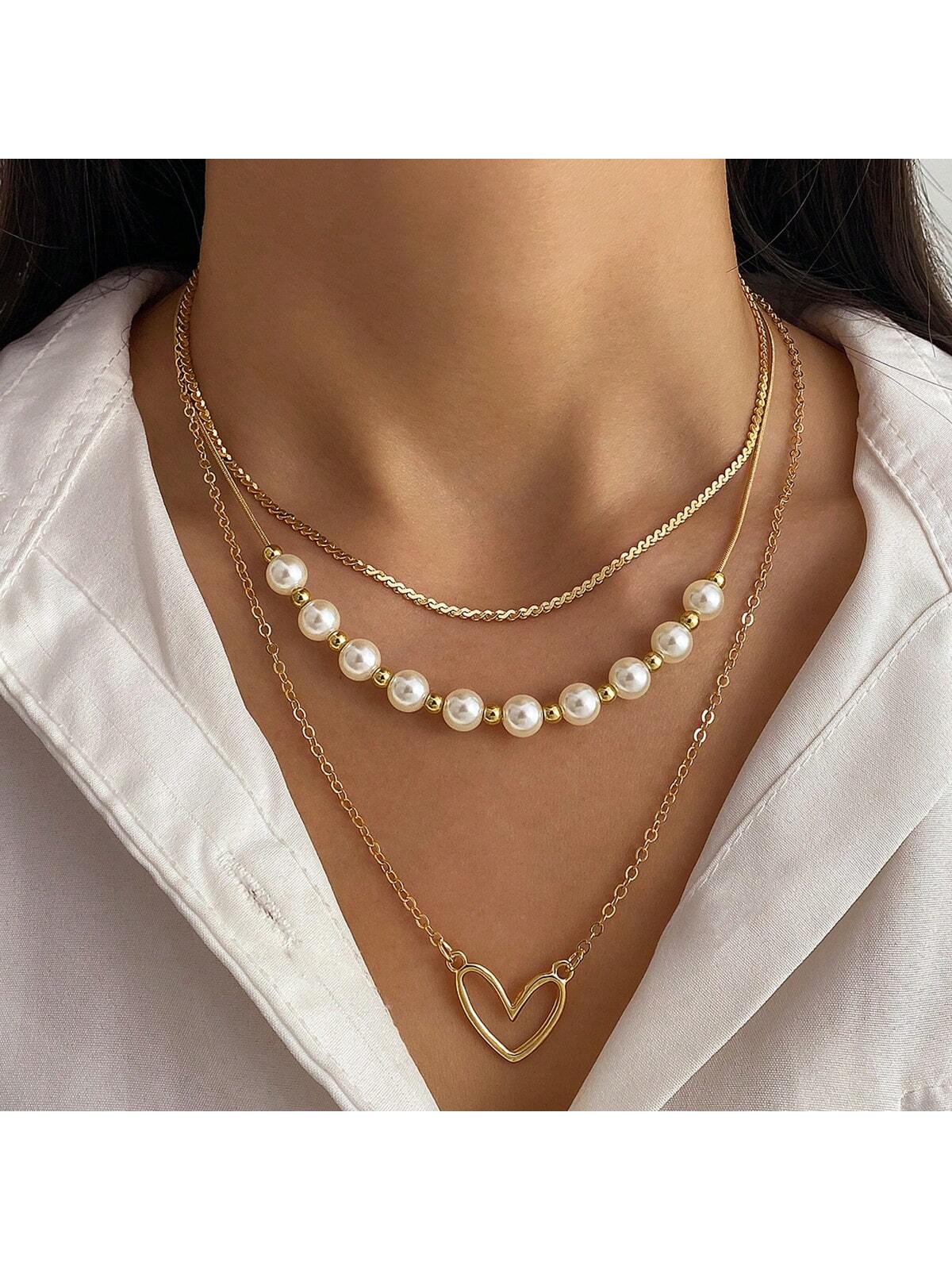 • 3pcs/Set Multi-Layer Necklace With Heart Shaped & Faux Pearl Charm, Gold Tone, Fashionable & Vintage Style Valentines,Mom,Mother,Mother's Day,Gift