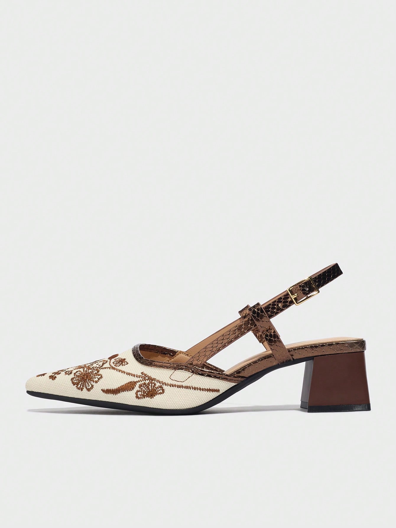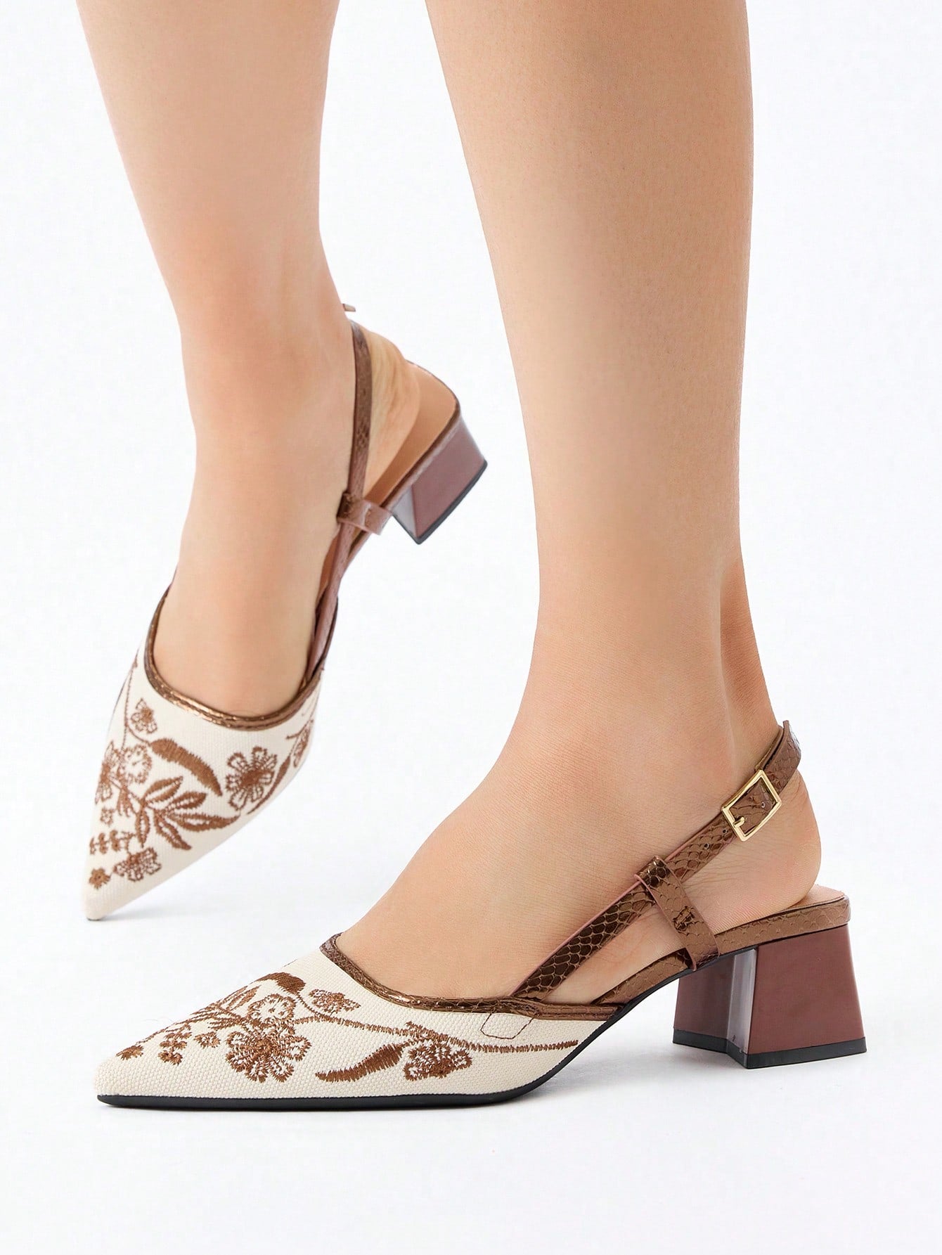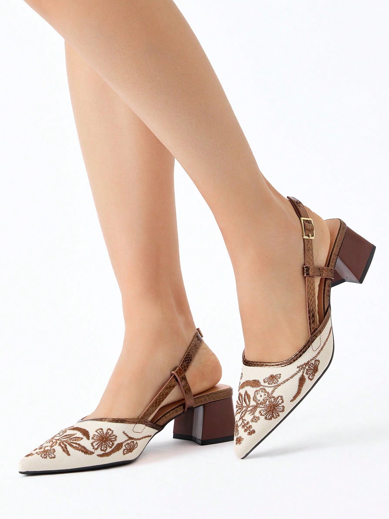 • Women's Floral Embroidery Pointed Toe Slip-On Chunky High Heel Shoes, Fashion Versatile Commute Mule Shoes, Elegant For Party, Wedding, Formal Occasion, Suit With Dress - Coffee Brown